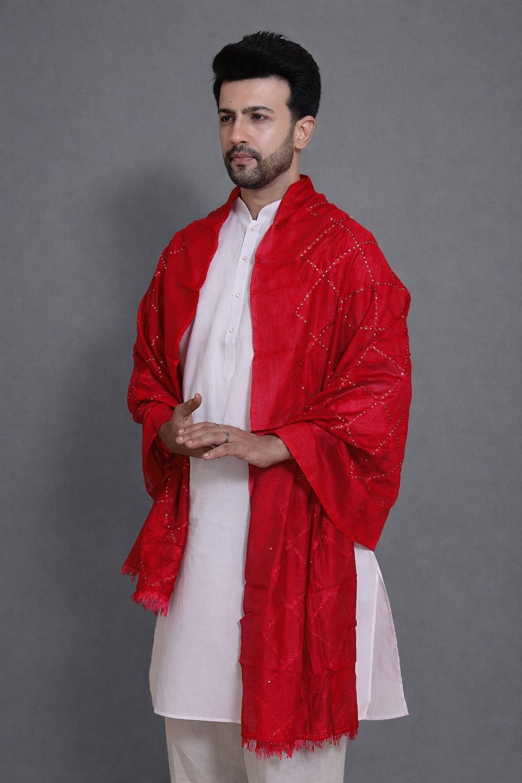 Black Embellished Box Sequence Dupatta For Men is thoughtfully designed using premium-quality fabric to offer a perfect balance of comfort, elegance, and durability. The soft and breathable texture ensures a pleasant wearing experience, making it suitable for long hours without discomfort.